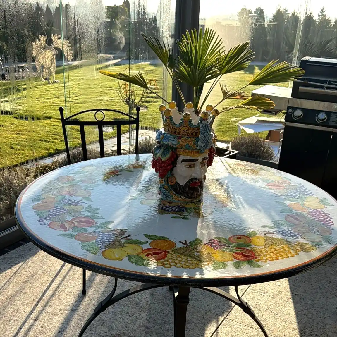 Il tavolo in pietra lavica maiolicata decorata a mano con i decori tradizionali della ceramica di Caltagirone è un’opera d’arte unica, che unisce la bellezza della tradizione artigianale millenaria di Caltagirone alla solidità e alla durata della pietra lavica. Ogni tavolo viene realizzato con grande cura da abili artigiani che applicano i decori a mano, garantendo una lavorazione artigianale di alta qualità.